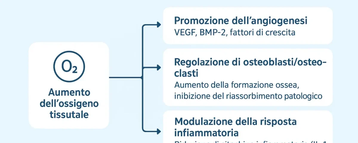 OTI fornisce ossigeno al 100% a pressioni >1 atm, innalzando la PO₂ nei tessuti ischemici e contrastando l’ipossia locale che è centrale nella patogenesi dell’osteonecrosi. Questo ripristino della PO₂ è il presupposto primario per gli altri effetti biologici (promozione della riparazione, sopravvivenza cellulare). PMC+1