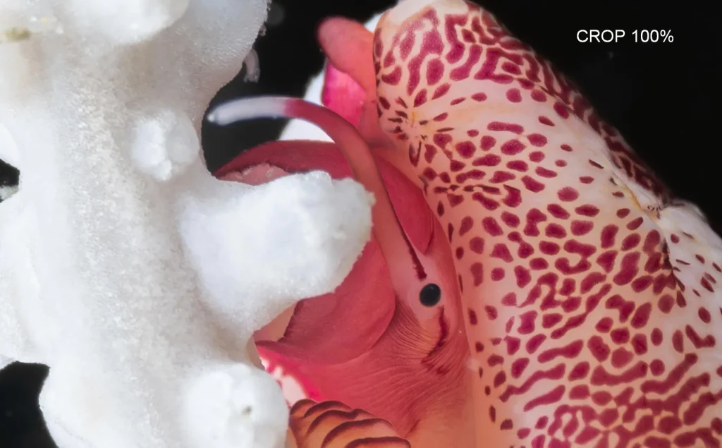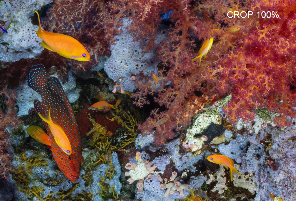 L’unico piccolo limite tecnico rispetto alle reflex è il tempo minimo di sincronizzazione del flash: 1/200s contro 1/250s della D850 o 1/400s della Sony A1. Nella maggior parte dei casi, non è un problema, ma in condizioni di forte luce ambiente, come nelle acque tropicali o su fondali sabbiosi e poco profondi, può diventare un po’ fastidioso. Fortunatamente, questo limite può essere facilmente superato lavorando a ISO base, 64 o 32 e chiudendo molto il diaframma. Naturalmente, per fare ciò, è necessario disporre di flash con la potenza adeguata.