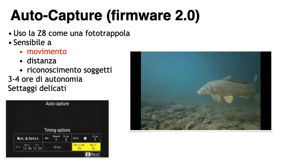 A partire dal firmware 2.0, Nikon ha lanciato la funzione Auto-Capture, che trasforma la Z8 in una sorta di fototrappola. LA fotocamera è infatti in grado di scattare foto in modo autonomo, rispondendo a movimenti, distanze o riconoscimento dei soggetti. È una funzione ancora da esplorare, che richiede impostazioni precise e ha un’autonomia limitata (3-4 ore), ma offre opportunità davvero interessanti per documentare il comportamento degli animali senza lil disturbo introdotto dalla presenza del fotografo.