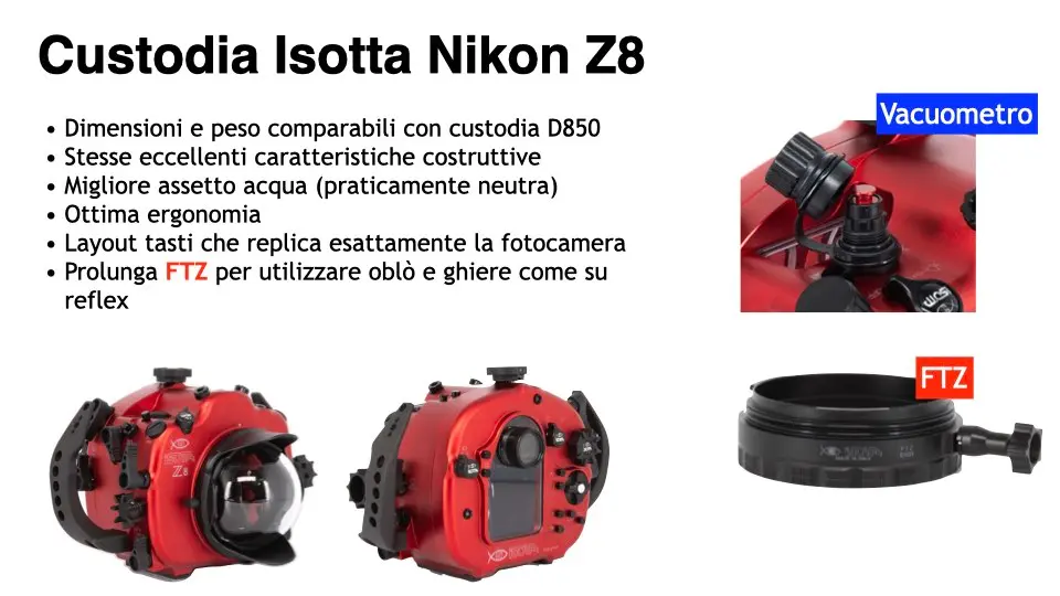 La custodia Isotta per la Nikon Z8 è, come sempre, un perfetto equilibrio tra estetica e funzionalità. Il suo peso e le dimensioni sono simili a quelli della D850, ma l’assetto in acqua è decisamente migliore essendo praticamente neutra. La costruzione in alluminio anodizzato, l’ergonomia dei comandi e la precisione meccanica sono all’altezza degli standard che Isotta ci ha abituato a conoscere. L’unica vera differenza è la disposizione dei tasti, che richiede un po’ di tempo per essere memorizzata, ma dopo qualche immersione diventa del tutto naturale. Per la prima volta, ho installato un vacuometro e posso dire che mi ha già salvato due volte da potenziali infiltrazioni: un piccolo accessorio che fa una grande differenza in termini di sicurezza e tranquillità.