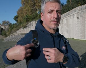 Assieme al D Ring dello spallaccio di sinistra è presente un anello di gomma per fissare il corrugato del sacco, come si vede nella configurazione completa della foto d'apertura.